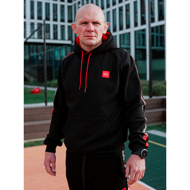 Bluza uszyta została z wysokiej klasy 100% bawełny o gramaturze 340g. Po lewej stronie znajduje się czerwona metka żakardowa z logo naszej marki. Bluza jedyna w swoim rodzaju dzięki wszytej taśmie lampasowej po długości rękawów. Całość dopełnia czerwony kaptur od środka oraz czerwone sznurki. Tkane metki znajdują się: przy ściągaczu wewnątrz karku oraz na szwie bluzy po lewej stronie. Nasze kroje zostały poprawione, aby idealnie pasowały dla męskiej, jak i damskiej części naszych fanów. Poprawiliśmy również rękawy - teraz nie są takie szerokie.