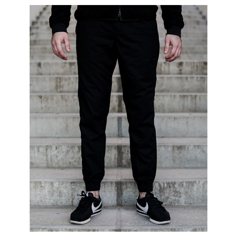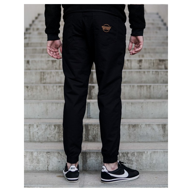 Spodnie tkaninowe w kroju 'jogger' W pasie guma i trok Klips żakardowy z rozmiarem w przedniej kieszeni Z boku nogawki haft Z tyłu kieszonka na guzik Dół nogawek zakończony gumą