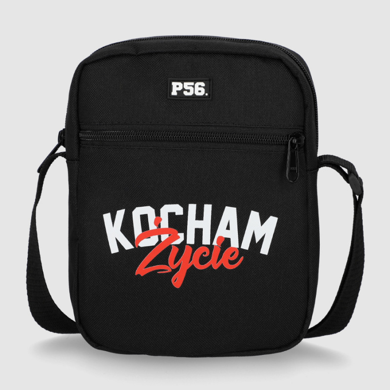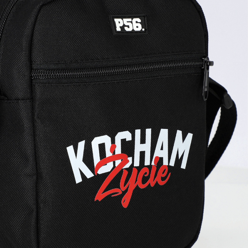 Cechy produktu: z przodu logotyp marki P56 na przedniej mniejszej kieszeni firmowy nadruk trzy komory, dwie mniejsze, jedna duża wszystkie suwaki marki YKK pasek z plastikową regulacją