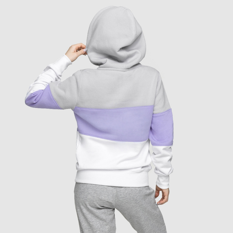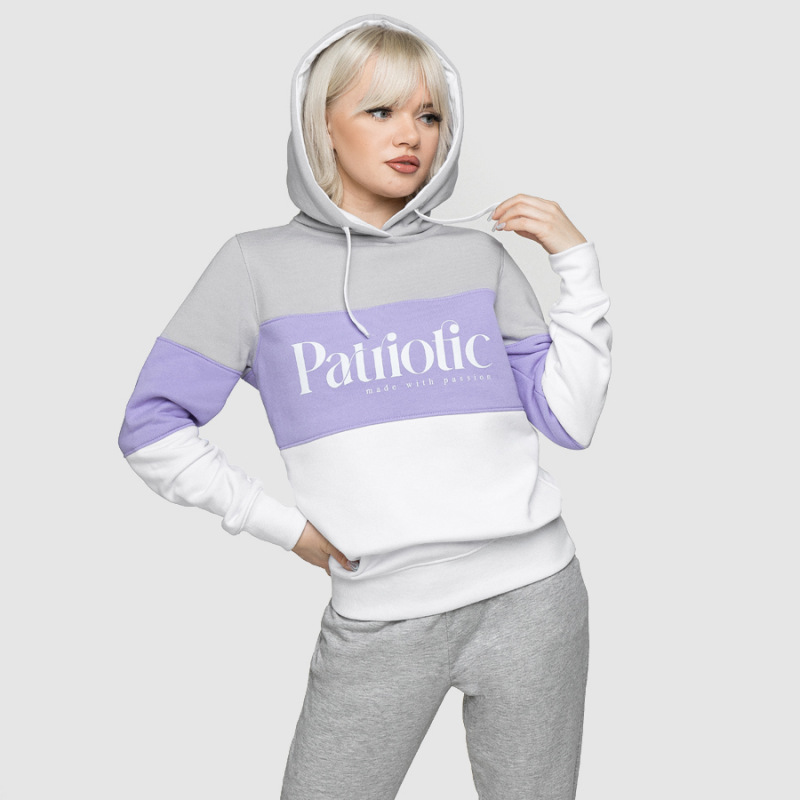 Cechy produktu: Klasyczny bluza z kapturem Na przodzie widoczny nadruk "Patriotic made with passion" w białym kolorze Kolory bluzy: jasny szary/biały/fiolet Napotnik w kolorze fioletowym