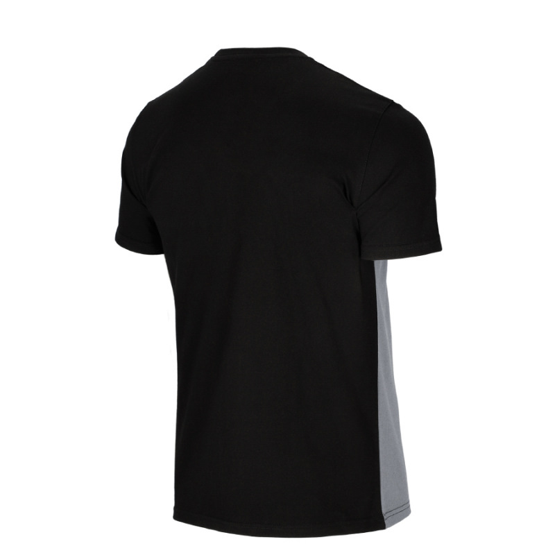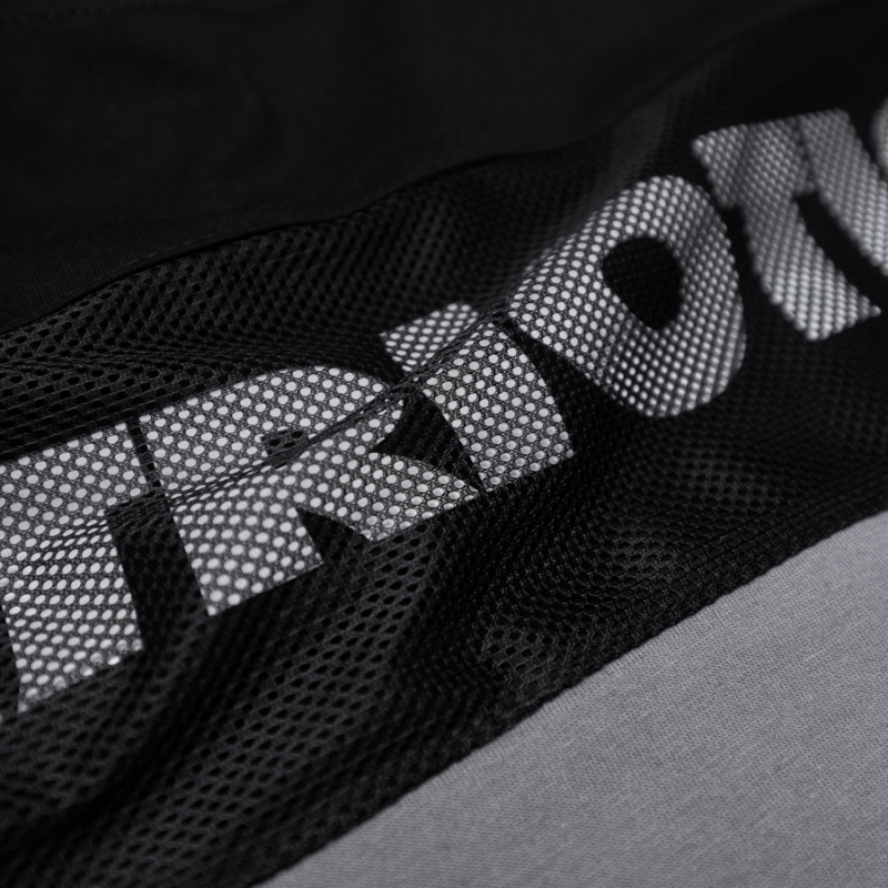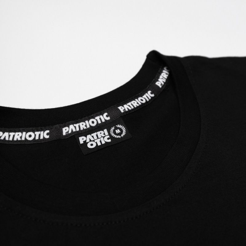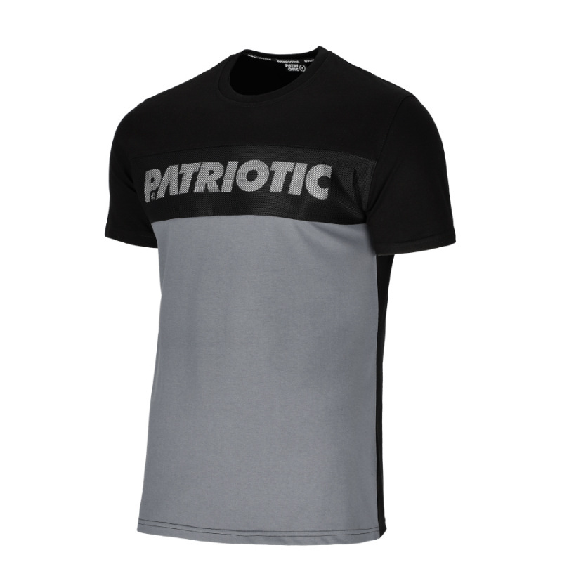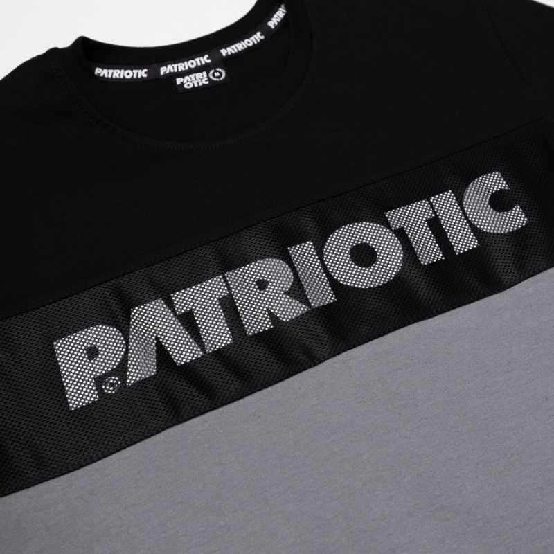 Czarno-szary t-shirt zdobi siatka, pod którą znajduje się nadruk "Patriotic".