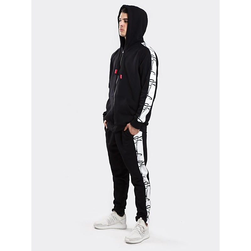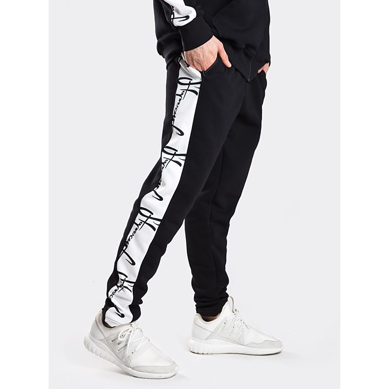 Spodnie dresowe ze zwężającymi się nogawkami Z boku wstawki z zadrukowanego poliestru Kieszenie na zamek Pas z gumą i trokiem Sznurki zakończone żakardowymi klipsami 90% CO, 10% PES, 280 g/m2