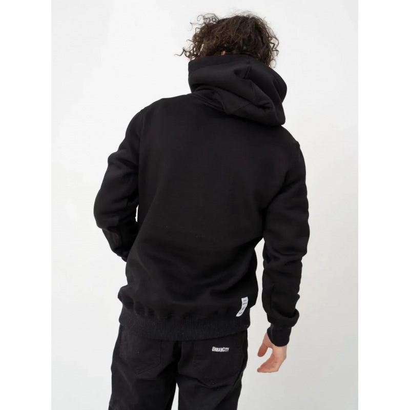 Czarna bluza z nadrukiem o regularnym kroju. Posiada kaptur regulowany sznurkiem i kieszeń typu kangur. Uszyta w Polsce z wysokogatunkowej bawełny.