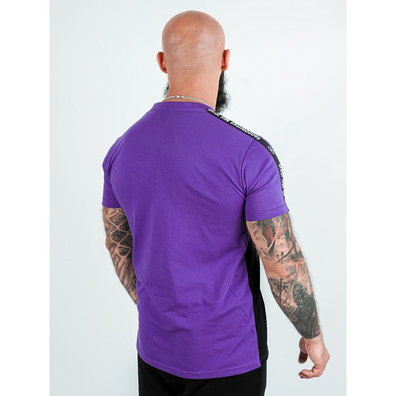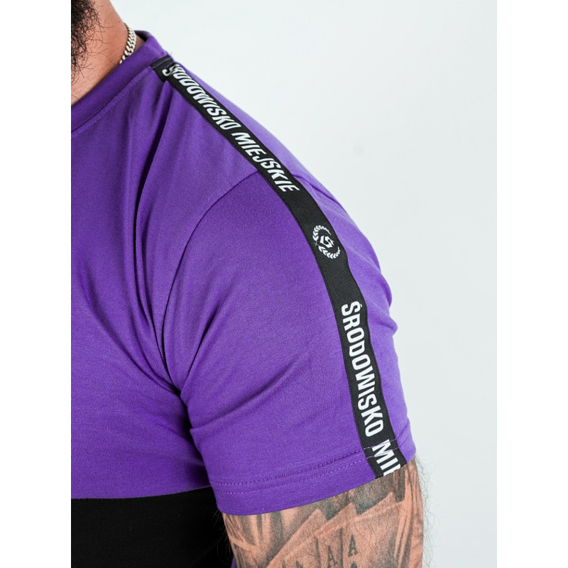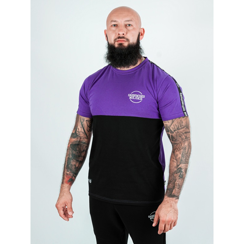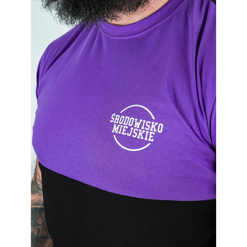 Klasyczna forma koszulki zostaje ożywiona poprzez dwie kontrastujące strefy kolorystyczne. Górna część, sięgająca tuż poniżej linii klatki piersiowej, w intensywnym fiolecie, płynnie przechodzi w dolną, czarną część. Na lewej piersi umieszczono precyzyjny sitodruk z logo Środowisko Miejskie – subtelny, lecz wyrazisty akcent brandingu. Rękawy zdobią markowe lampasy wszyte w szew, które dodają koszulce sportowego charakteru i podkreślają rodowód streetwearu.