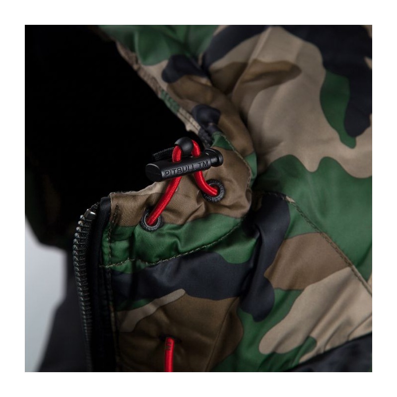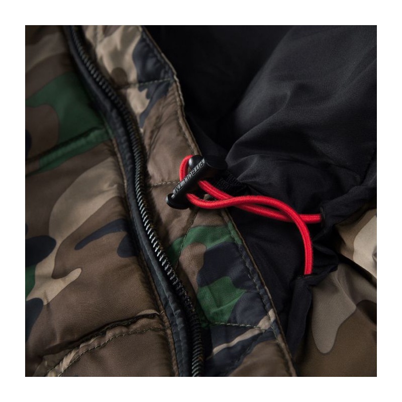Kurtka posiada regulowany za pomocą elastycznych kontrastowych sznurków kaptur z wysoką stójką.