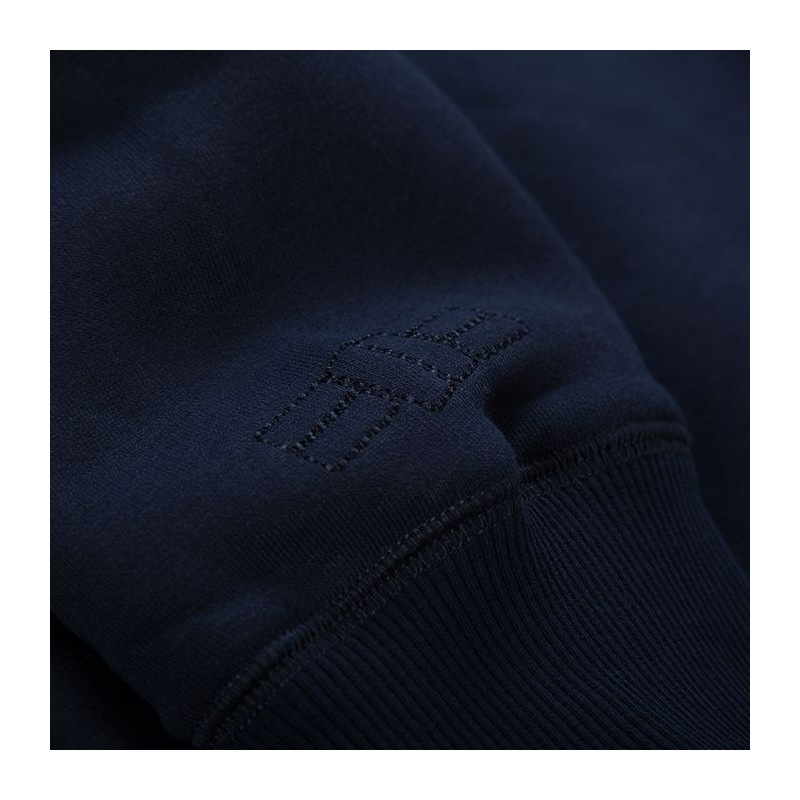 Wygodne, sportowe ubranie uszyto z grubej bawełny o gramaturze 400g/m, przez co jest w niej ciepło. Ochronę przed zimnym powietrzem zapewnia wysoki kołnierz, który można dopasować suwakiem, jak również ściągacze i specjalnie obszyte otwory na kciuki. Z przodu, na dole, mieści się duża kieszeń, w której można trzymać rzeczy potrzebne w czasie wyjść. Przy łączeniu z kołnierzem, wewnątrz bluzy umieszczono tasiemkę wykonaną z jedwabiu, która osłania skórę karku.