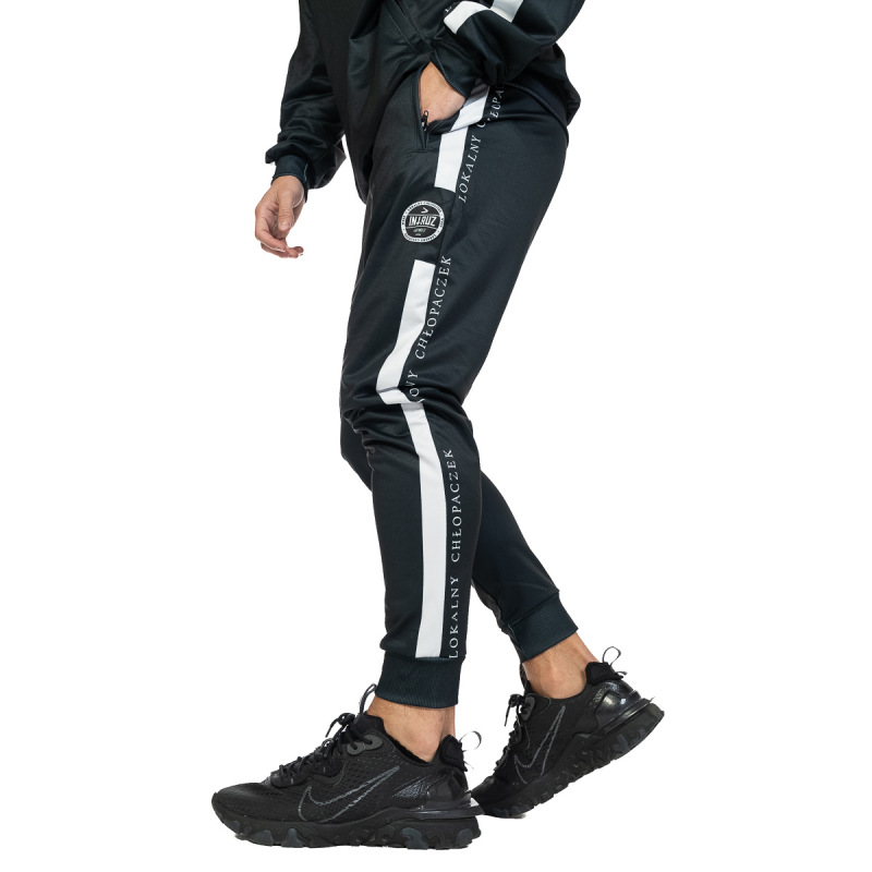 Czarne spodnie o idealnie dopasowanym kroju zdobi umieszczona na środku ksywa rapera. Po bokach umieszczono dwa pasy: biały oraz z napisem "Lokalny Chłopaczek",a także dwa okrągłe, unikalne detale.Posiadają także dwie pojemne kieszenie z przodu zapinane na zamkii jedną tylną zapinaną na rzep. W pasie znajduje się ściągacz ze sznurkiem. Produkt wykonany jest z wysokiej jakości dzianiny i zwieńczony został unikalnymi metkami sygnowanymi logo wytwórni.