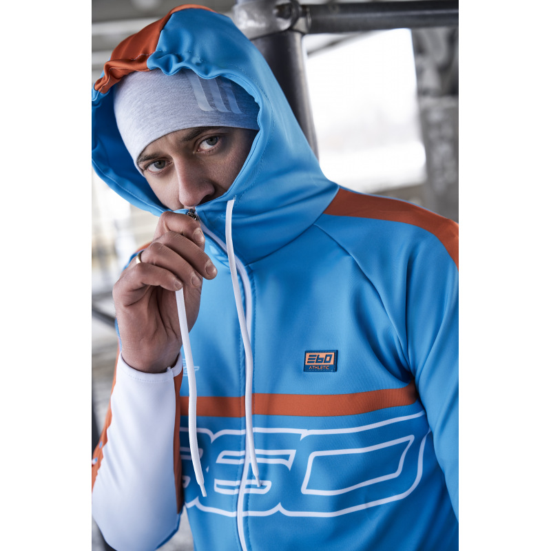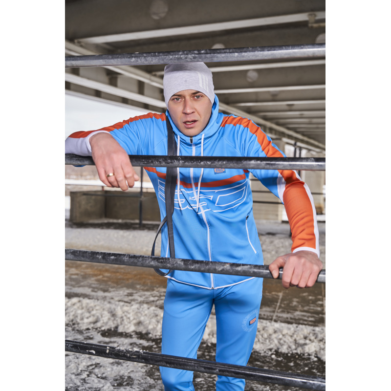 Komplet dresowy o sportowym charakterze. Wykonany 100% z poliestru połączonego z elastanem. Idealnie sprawdza się przy aktywnościach fizycznych w pomieszczeniach oraz na świeżym powietrzu. Dopasowany krój umożliwia pełen zakres ruchu oraz swobodę. Bluza komin z kapturem na suwak, na piersi gumowy emblemat 360 Athletic. Spodnie posiadają wąskie nogawki o sportowym kroju, sznurek oraz gumę regulującą w pasie, dodatkowo suwaki w kostkach.