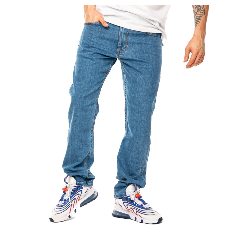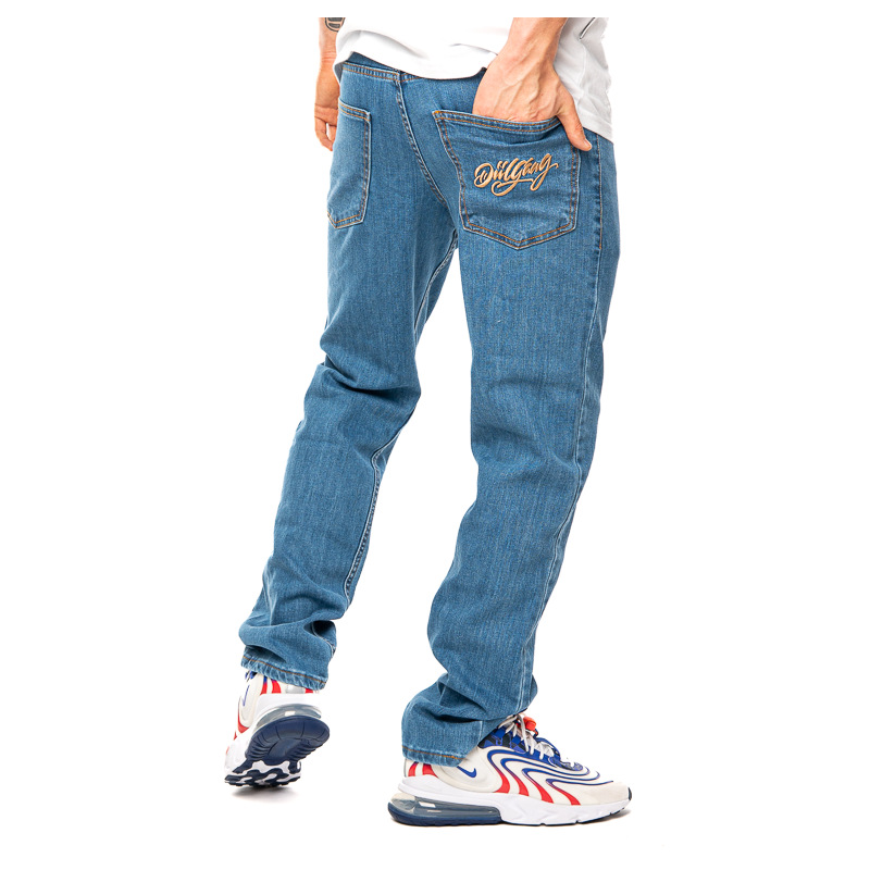 Jeansowe spodnie z haftem o regularnym kroju. Posiadają cztery kieszenie i szlufki wszyte w pasie.