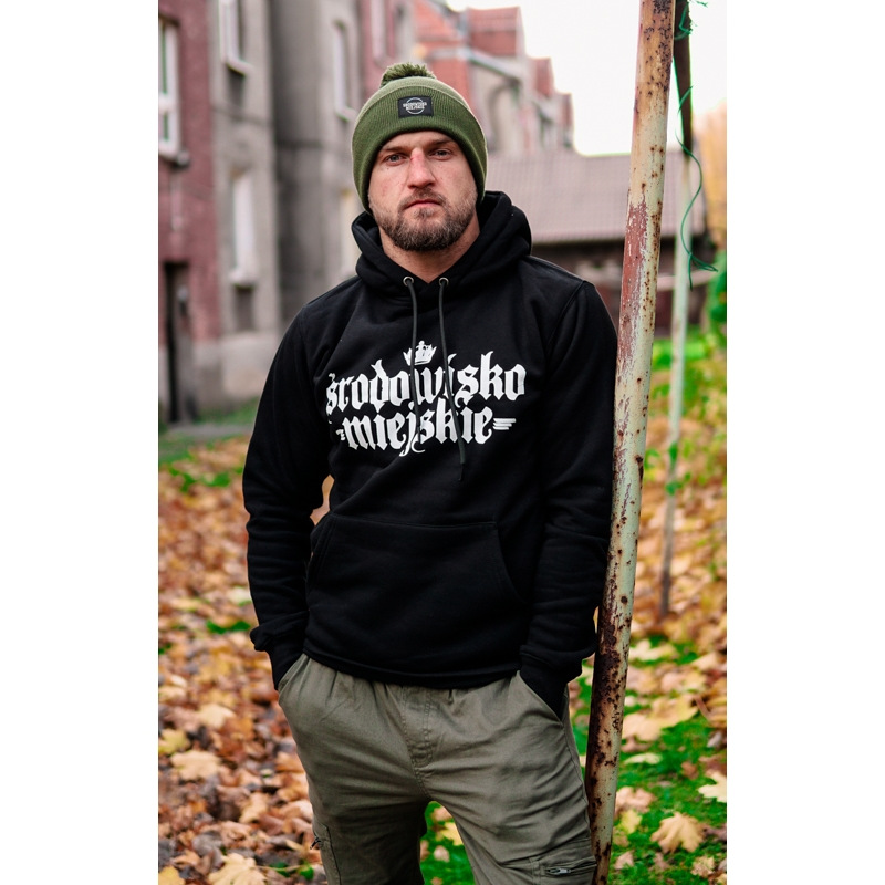 Bluza z dużym napisem Środowisko Miejskie na przodzie koszulki wykonana gotycką czcionką. Na plecach duży nadruk z widocznym przy nim logo naszej marki. Odważny styl wraca na ulice - musisz ją mieć w swojej szafie! Tkane metki znajdują się na bocznym szwie oraz przy ściągaczu wewnątrz karku. Bluza uszyta została z wysokiej klasy 100% bawełny o gramaturze 280g. Nadruki wykonane technologią sitodruku, dzięki czemu są bardzo wytrzymałe i odporne na ścieranie. Nasze kroje zostały poprawione, aby idealnie pasowały dla męskiej, jak i damskiej części naszych fanów. Poprawiliśmy również rękawy - teraz nie są takie szerokie.