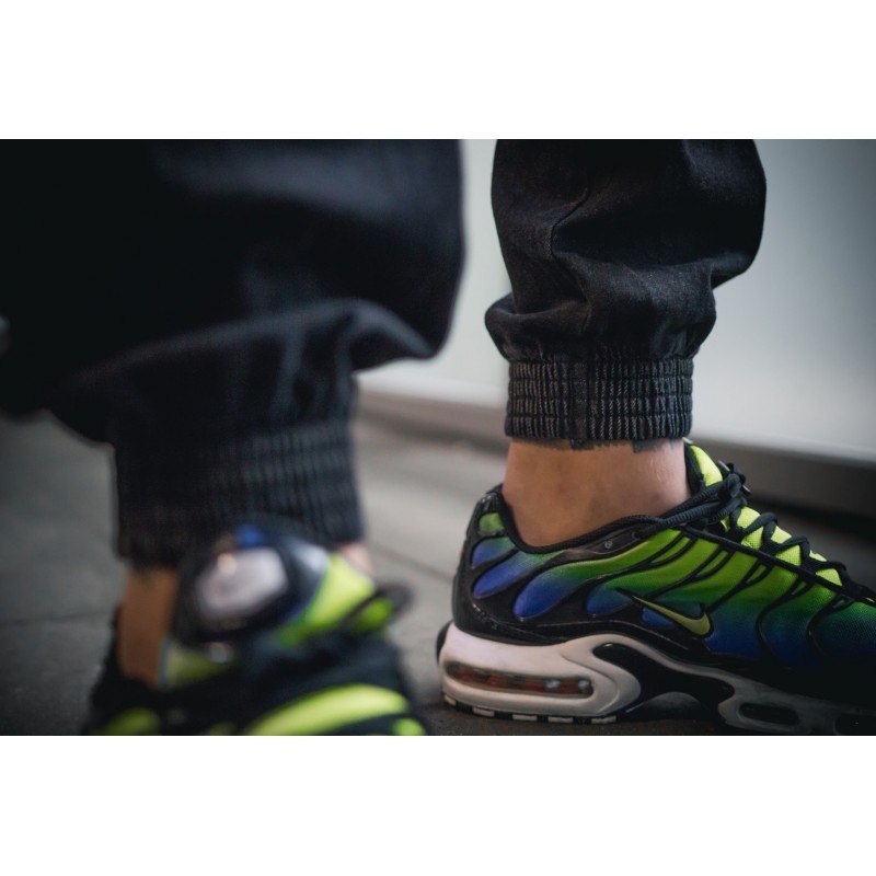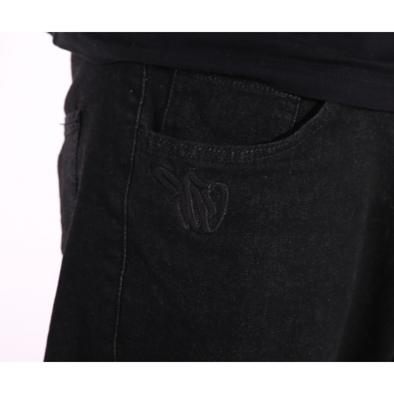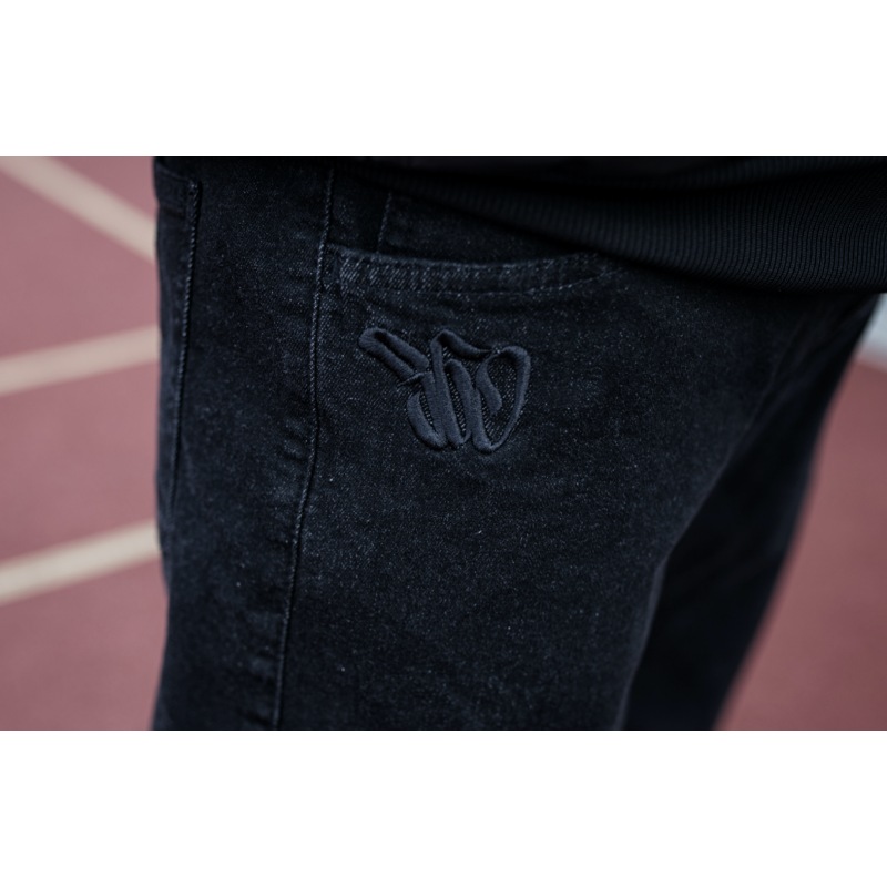 Spodnie Jogger czarne z czarnymi haftami, gumowy szeroki ściągacz w kostkach,