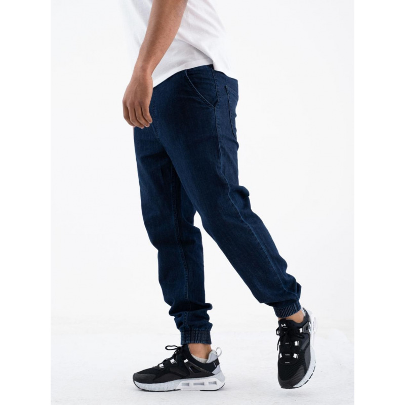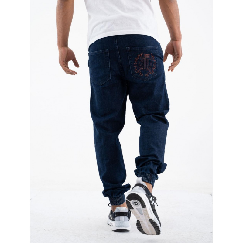 Jeansowe spodnie typu jogger o lekko slimowanym kroju. Spodnie z gumą w pasie i na dole nogawek. Regulowany obwód pasa za pomocą sznurka. Na froncie haft pod kolor prania spodni. Z tyłu nit metalowy w kształcie kastetu. Wyprodukowano w Polsce.