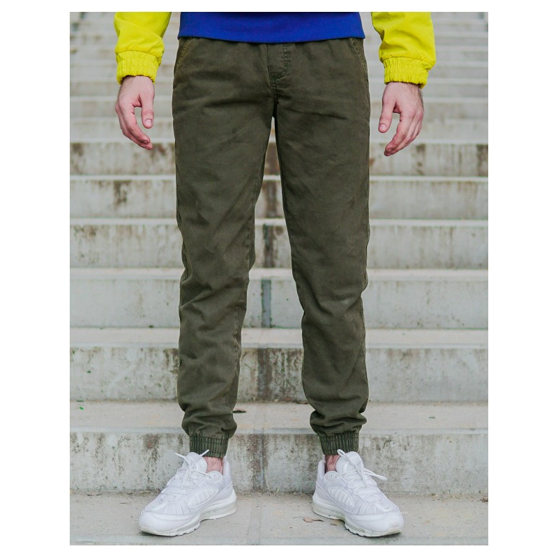 Spodnie tkaninowe w kroju 'jogger' W pasie guma i trok Klips żakardowy z rozmiarem w przedniej kieszeni Z boku nogawki haft Z tyłu kieszonka na guzik Dół nogawek zakończony gumą