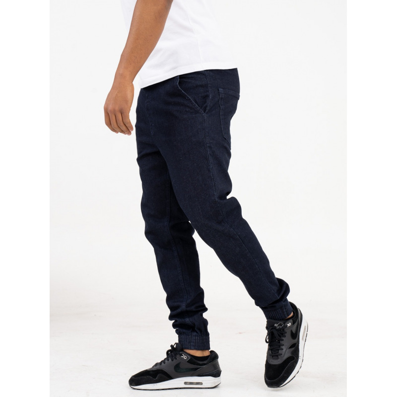 Jeansowe spodnie typu jogger. Spodnie z gumą w pasie i na dole nogawek. Regulowany obwód pasa za pomocą sznurka. Wyprodukowano w Polsce.