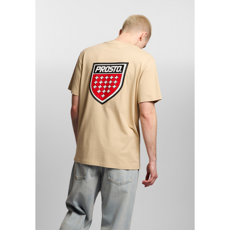T-shirt Shield Big Beige – męska koszulka z kolekcji Prosto, oparta na jednym z najbardziej rozpoznawalnych motywów marki. Duży nadruk tarczy Prosto na plecach to czysta klasyka i esencja DNA brandu – symbol, który wraca i zawsze działa. Regularny krój zapewnia codzienny komfort, a beżowa kolorystyka nadaje całości spokojny, ponadczasowy charakter, idealnie balansując wyrazisty znak Prosto. Koszulka wykonana w 100% z bawełny single jersey.