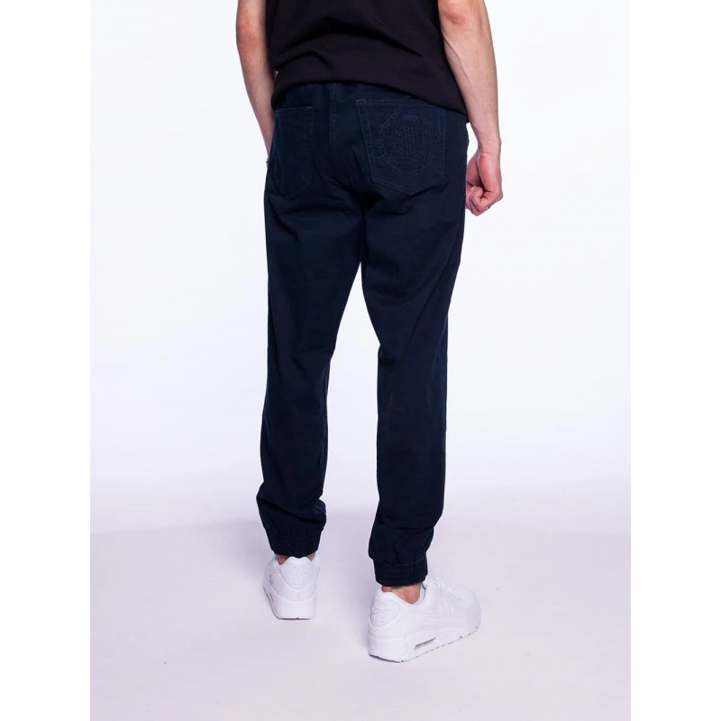 Jeansowe spodnie typu jogger o lekko slimowanym kroju. Spodnie z gumą w pasie i na dole nogawek. Regulowany obwód pasa za pomocą sznurka. Na froncie haft pod kolor prania spodni. Z tyłu nit w kształcie kastetu. Wyprodukowano w Polsce.