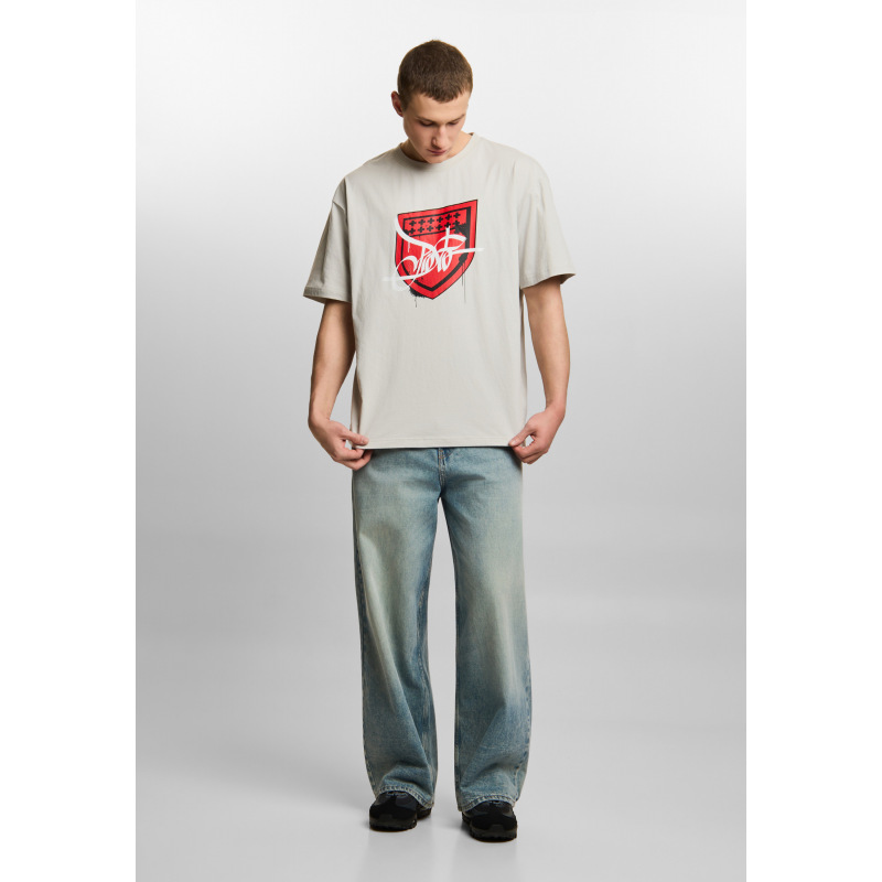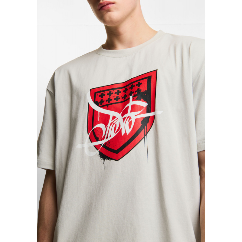 T-shirt Damage Target Silver Gray - męska koszulka Prosto w odcieniu silver gray z wyrazistą grafiką na froncie. Duża tarcza wygląda jak naruszona, przetarta, potraktowana sprayem - efekt kontrolowanego chaosu nadaje jej surowy charakter. To nie jest klasyczny print. To grafika, która wygląda jakby została nałożona warstwami i lekko zniszczona w ruchu. Szara koszulka męska o boxy kroju daje luz i swobodę, a mocny czerwony akcent buduje kontrast. Bawełniana koszulka, która przyciąga spojrzenia i robi stylizację sama.