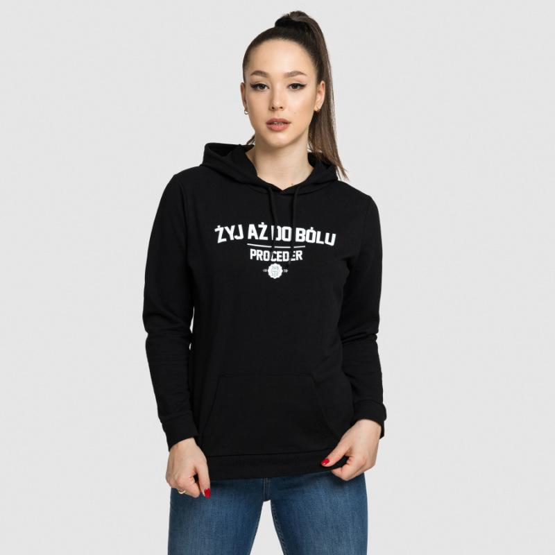 Bluza damska z kapturem marki ProcederMateriał: 90% bawełna, 10% poliesterWyprodukowano: w PolsceCechy produktu:z przodu duży nadrukwygodna przednia kieszeńkaptur ściągany za pomocą sznurka