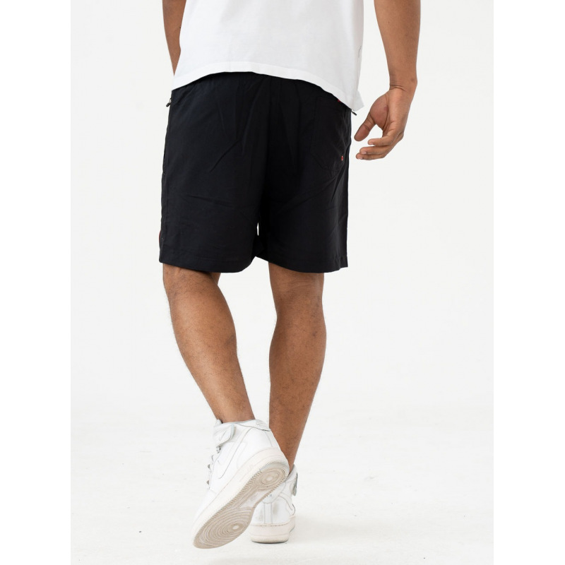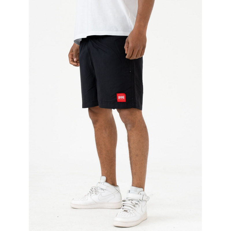 Spodenki z naszywką o regularnym kroju. Posiadają trzy kieszenie w tym dwie boczne zapinane na suwak. Podszyte siateczką od wewnętrznej strony - nadają się do pływania.
