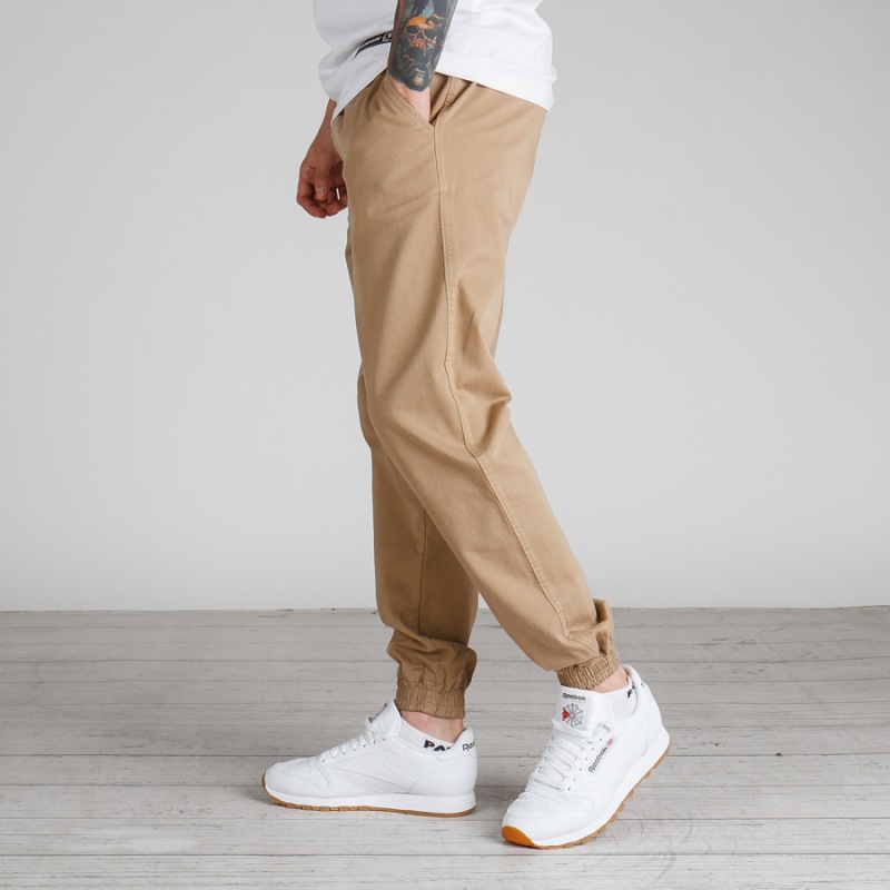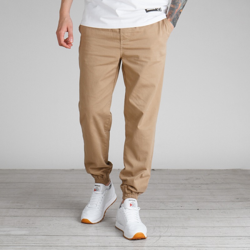 Spodnie materiałowe ze ściągaczem w dole nogawek.